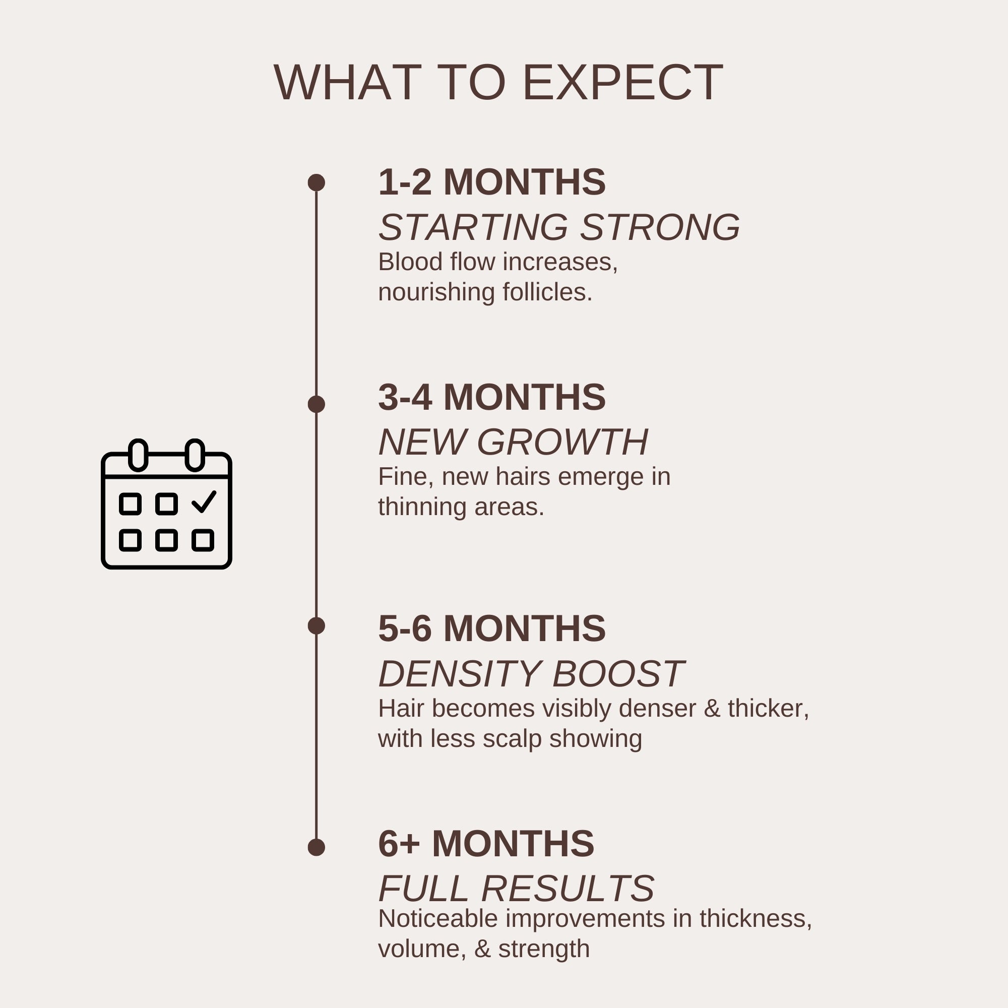 Most users notice less shedding in 4–6 weeks, with hair looking fuller by 8–12 weeks.