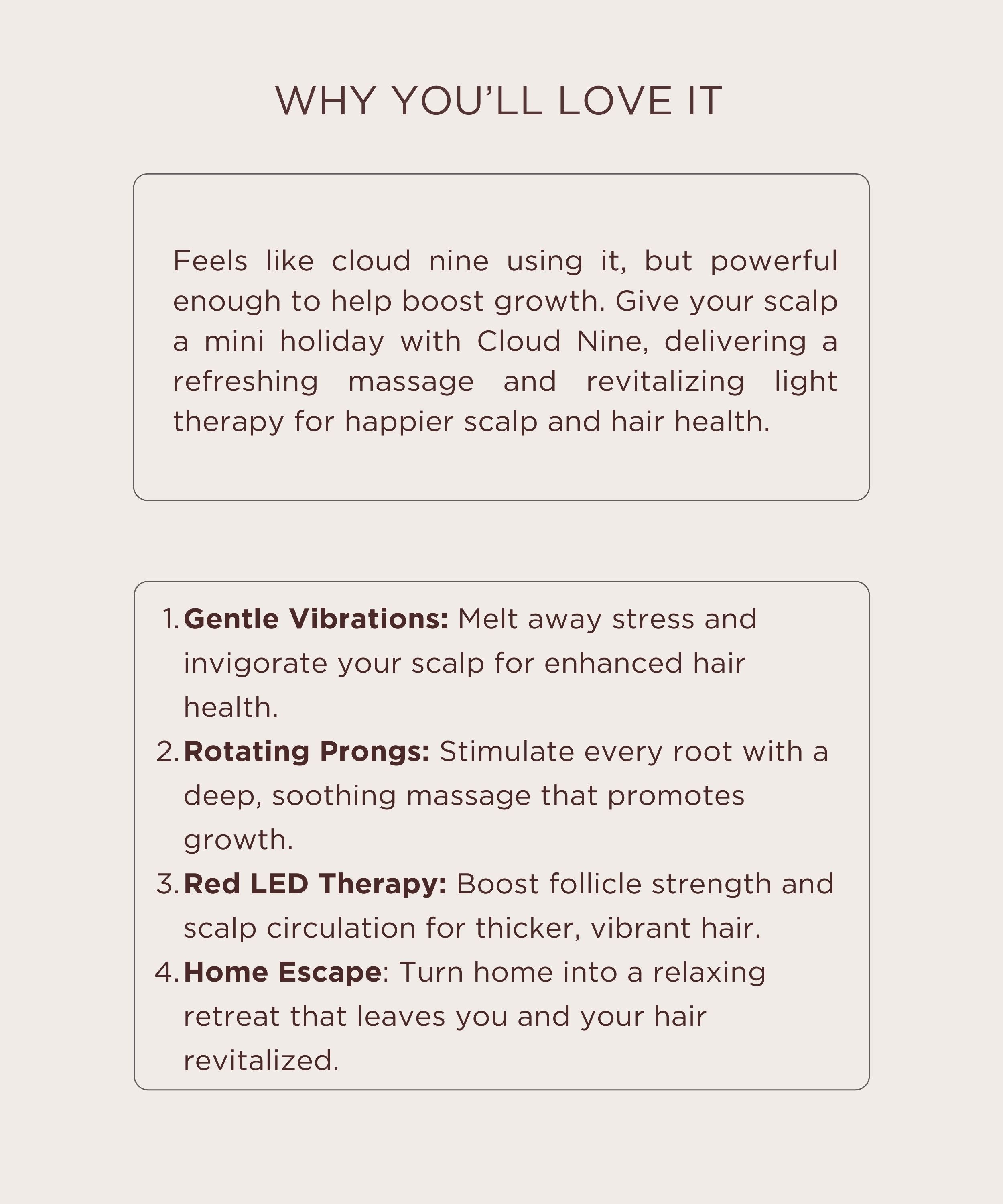 Fuller hair starts with a healthier scalp. Cloud 9 combines red light and gentle massage to support circulation, reduce tension, and create the conditions for stronger, more resilient hair over time. Just 15 minutes, a few times a week—no pressure, just quiet progress.