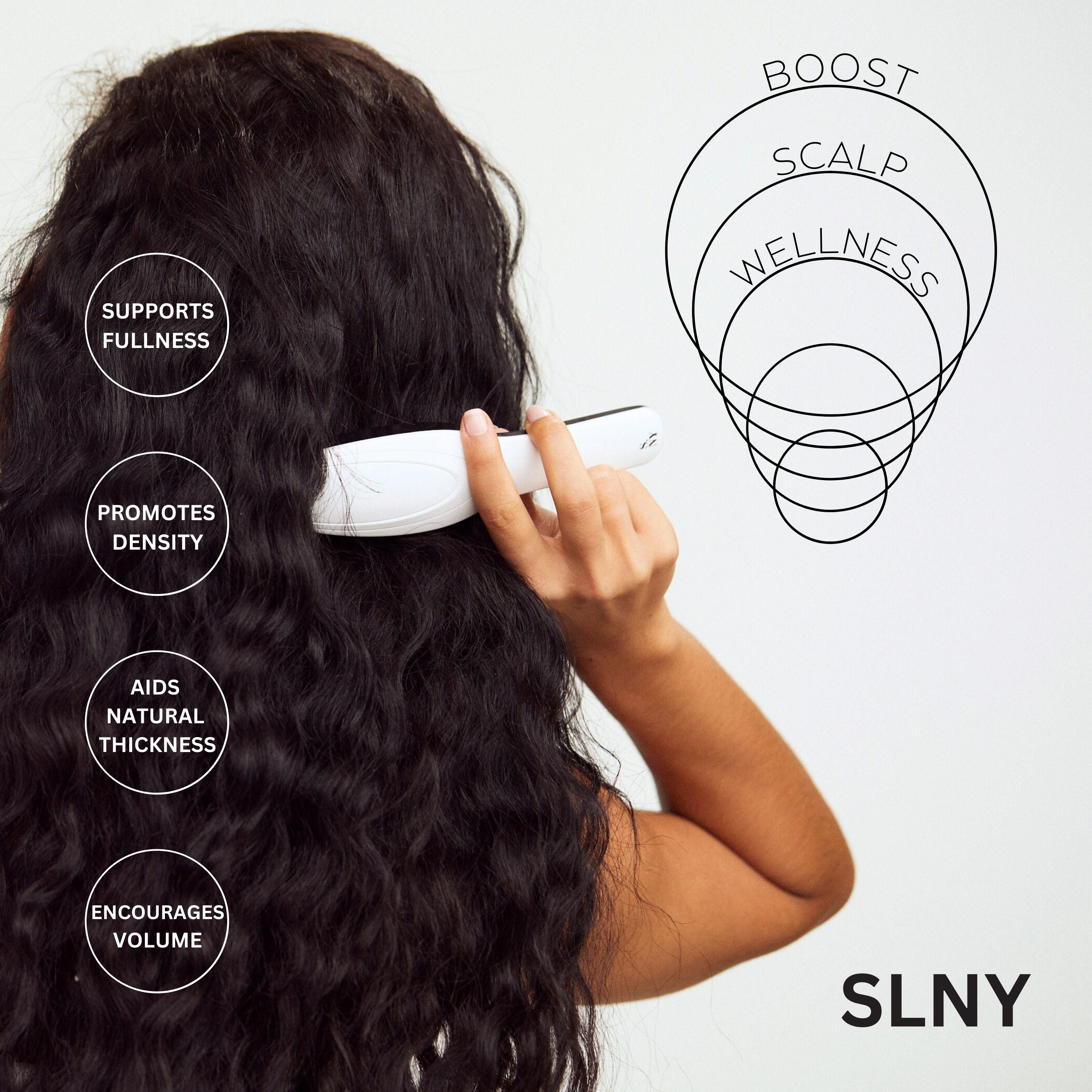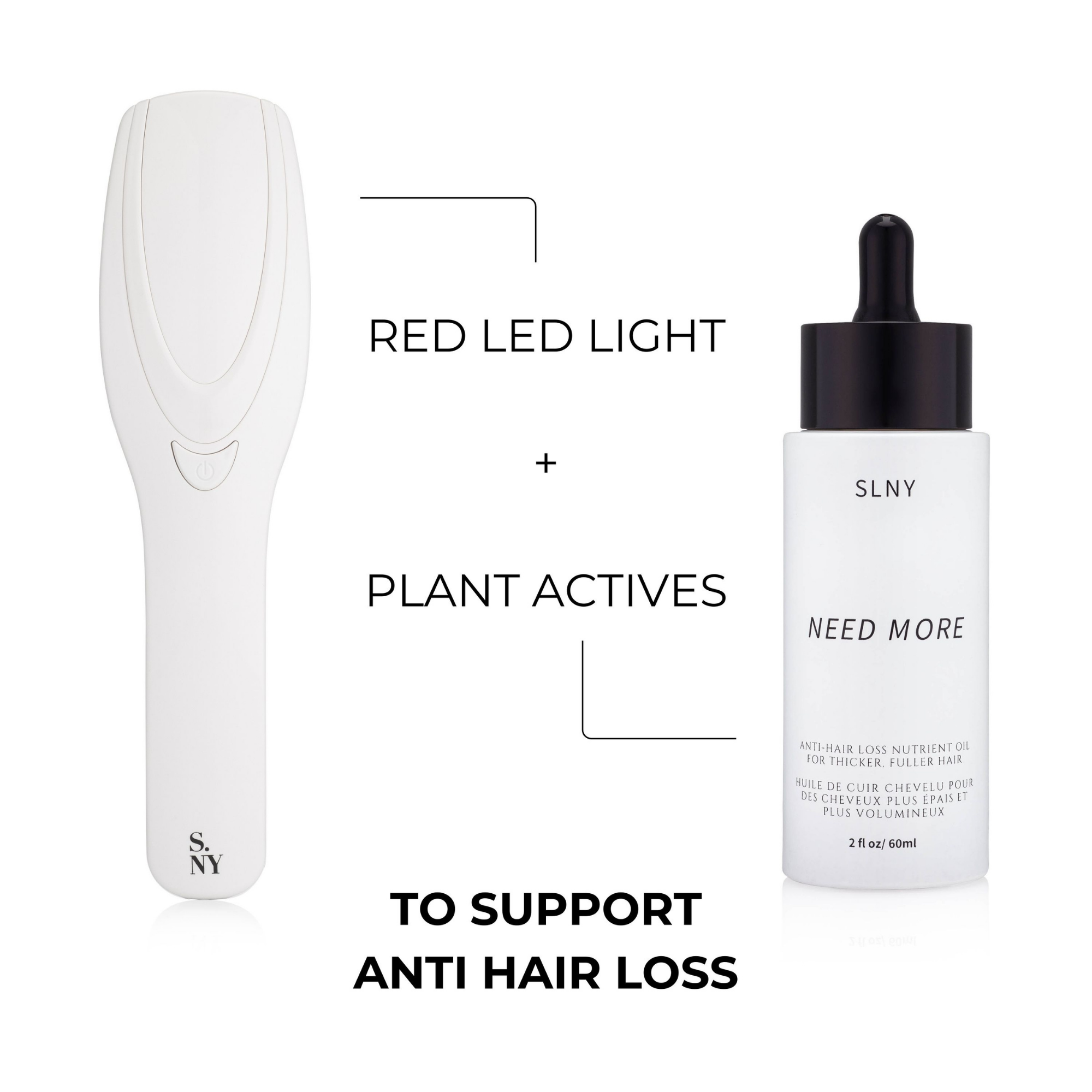 The brush uses red and blue LED light with massaging prongs to stimulate the scalp and increase circulation, creating the perfect environment for healthier hair growth. The serum nourishes the scalp—apply it 20 minutes before your shower for deep absorption.