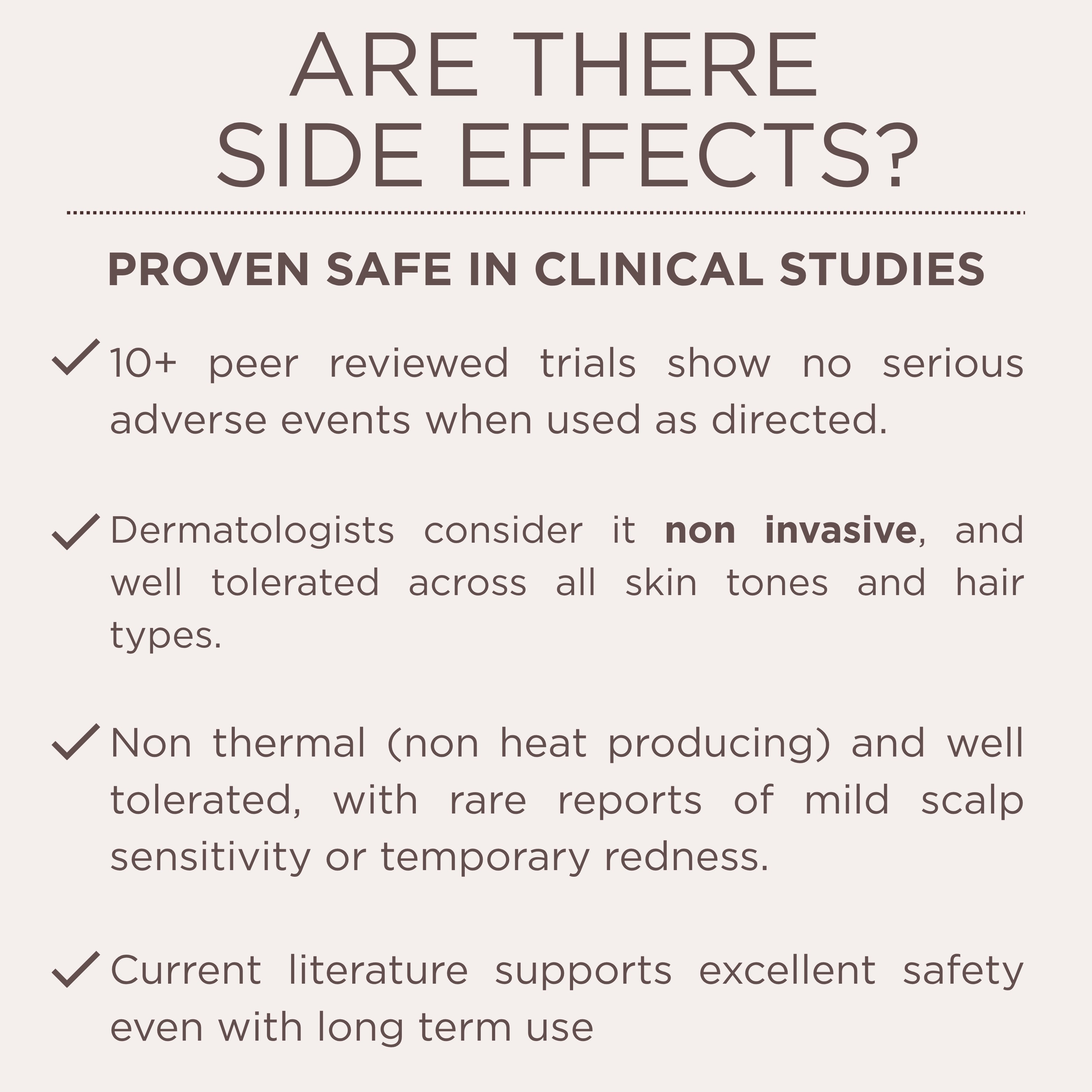 Red light therapy is considered very safe when used as directed. The wavelengths used in the Solaris LED Brush—630 nm, 660 nm, and 420 nm—are non-invasive and low-level, meaning they don’t damage skin or tissue. Some users may experience mild warmth or slight scalp sensitivity, which typically resolves quickly.