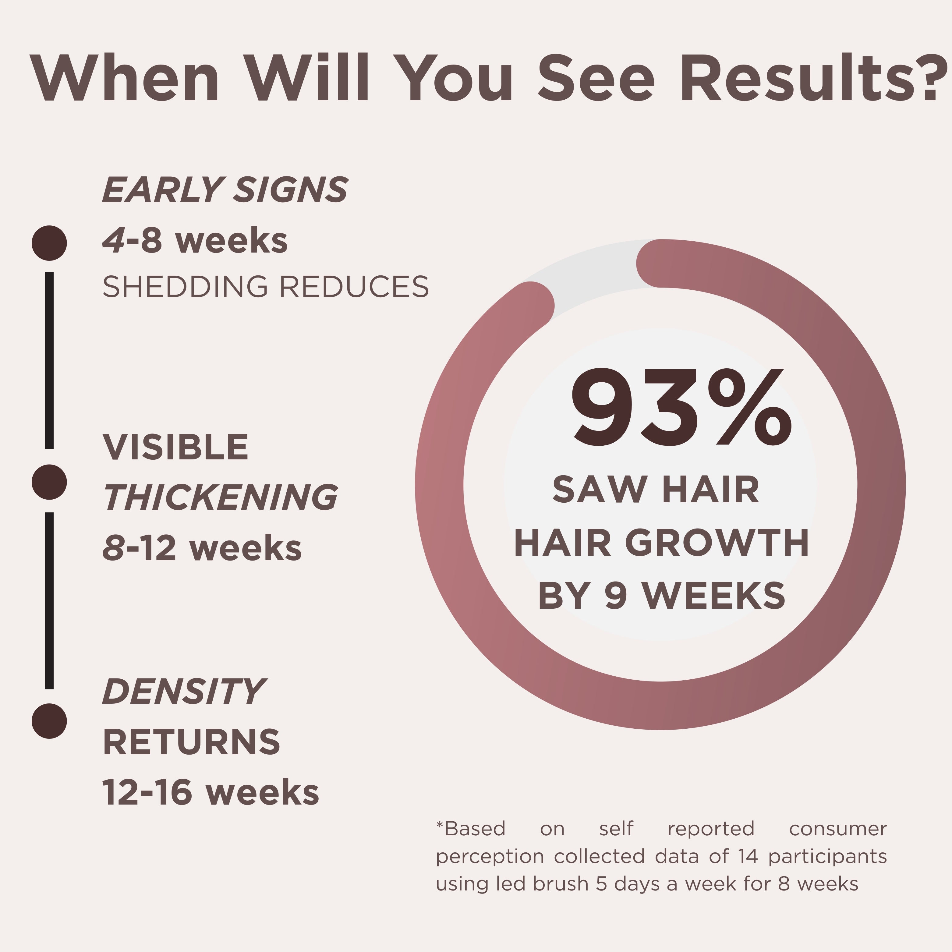Less shedding in 4–6 weeks, with hair looking fuller by 8–12 weeks