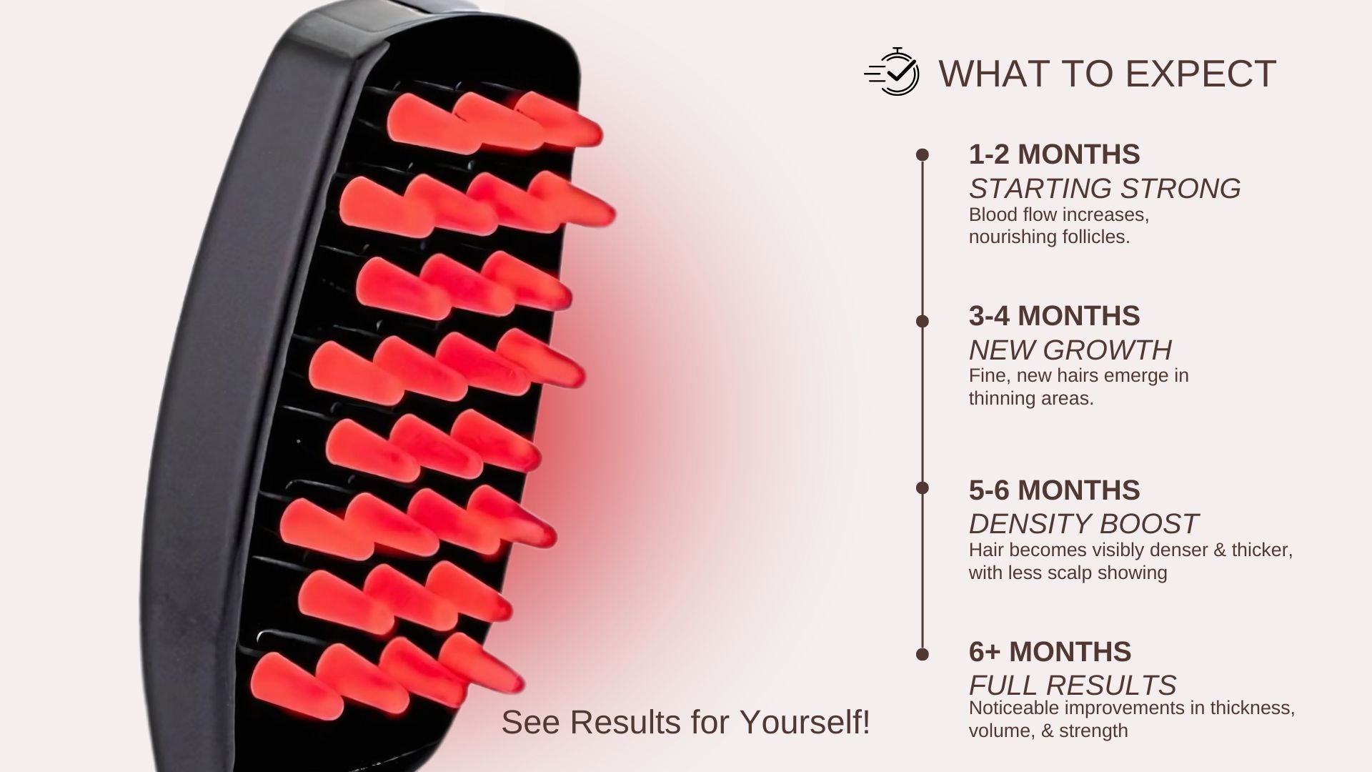 Just 20 minutes, 3–5 times per week can help support a calmer scalp and stronger hair. Many users see less hair on their brush and more confidence in as little as 4–6 weeks.