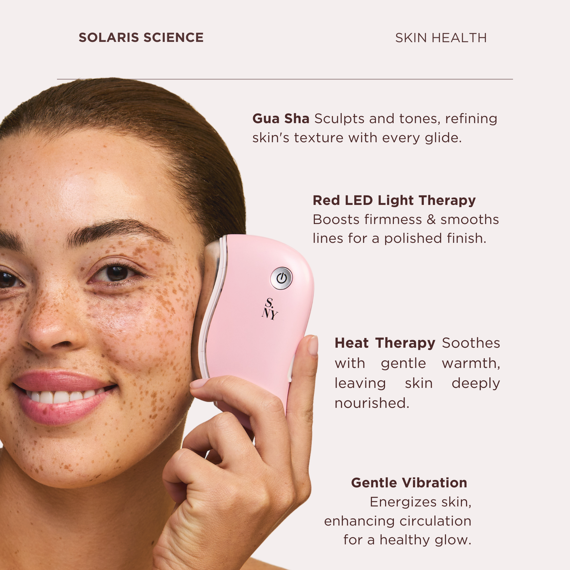 - Heated Gua Sha improves skin elasticity and enhances complexion.